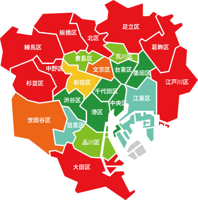 杉並区、中野区、練馬区、板橋区、北区、足立区、葛飾区、江戸川区、大田区 |